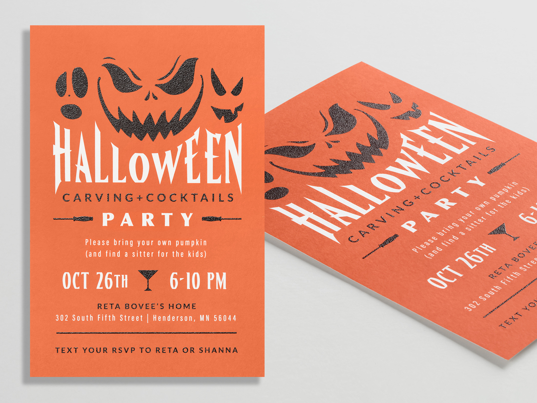 Our A8 carving party invitation went full-on festive with a digital orange background and raised black thermography print that brings the jack-o’-lantern to life. You can feel the design as much as you see it, which is perfect for tactile impact.