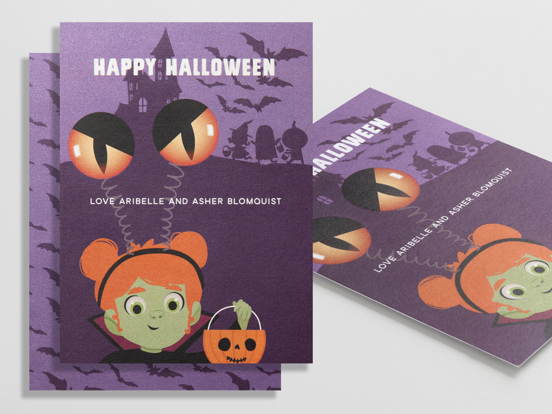For the kid-friendly bash, we printed an A6 invitation on shimmer paper with full-color digital on both sides. The bats on the back shimmer just right under the light, adding a touch of sparkle to every costume party RSVP.