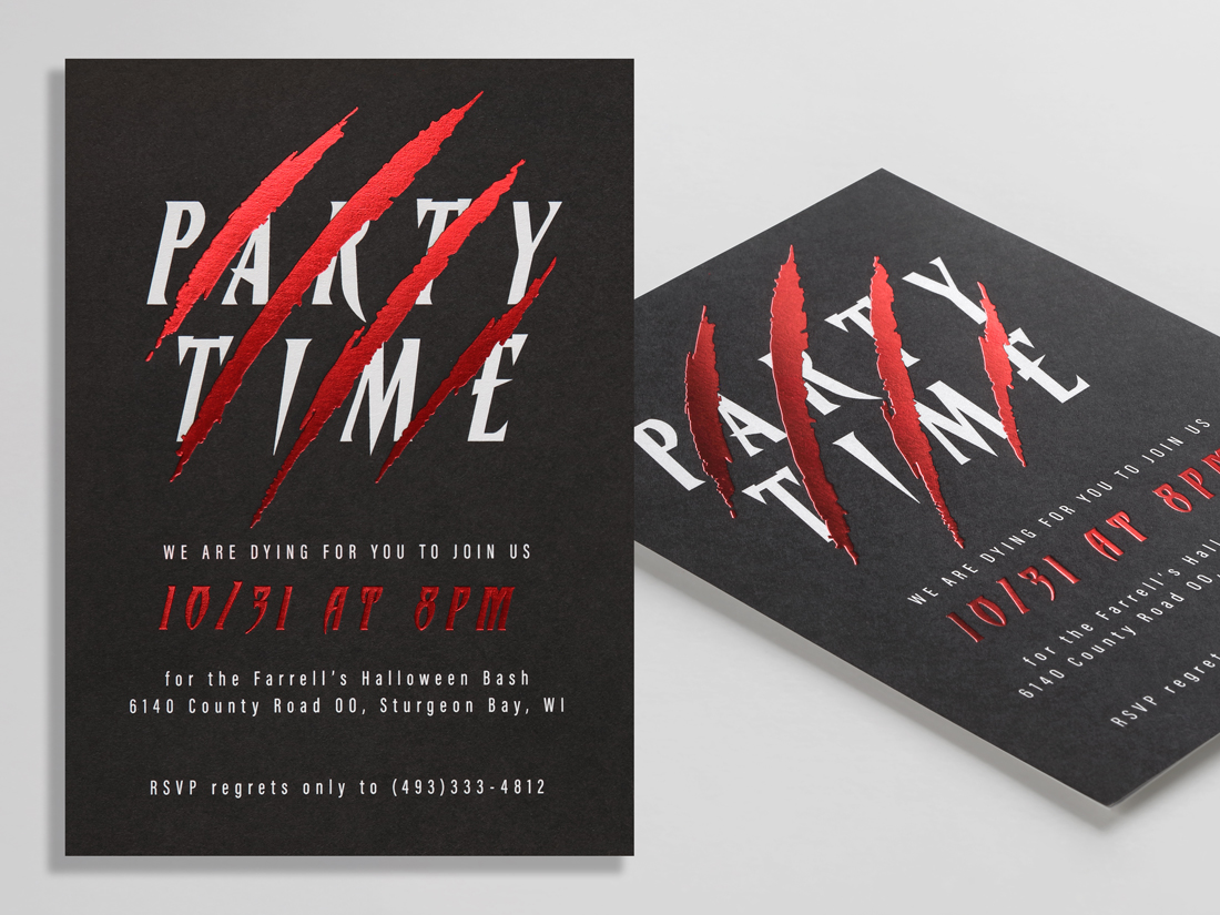 Looking for something edgier? One of our A7 invitations features glossy red foil slashes across a black background printed digitally. It’s giving haunted house energy, but in the best way possible.