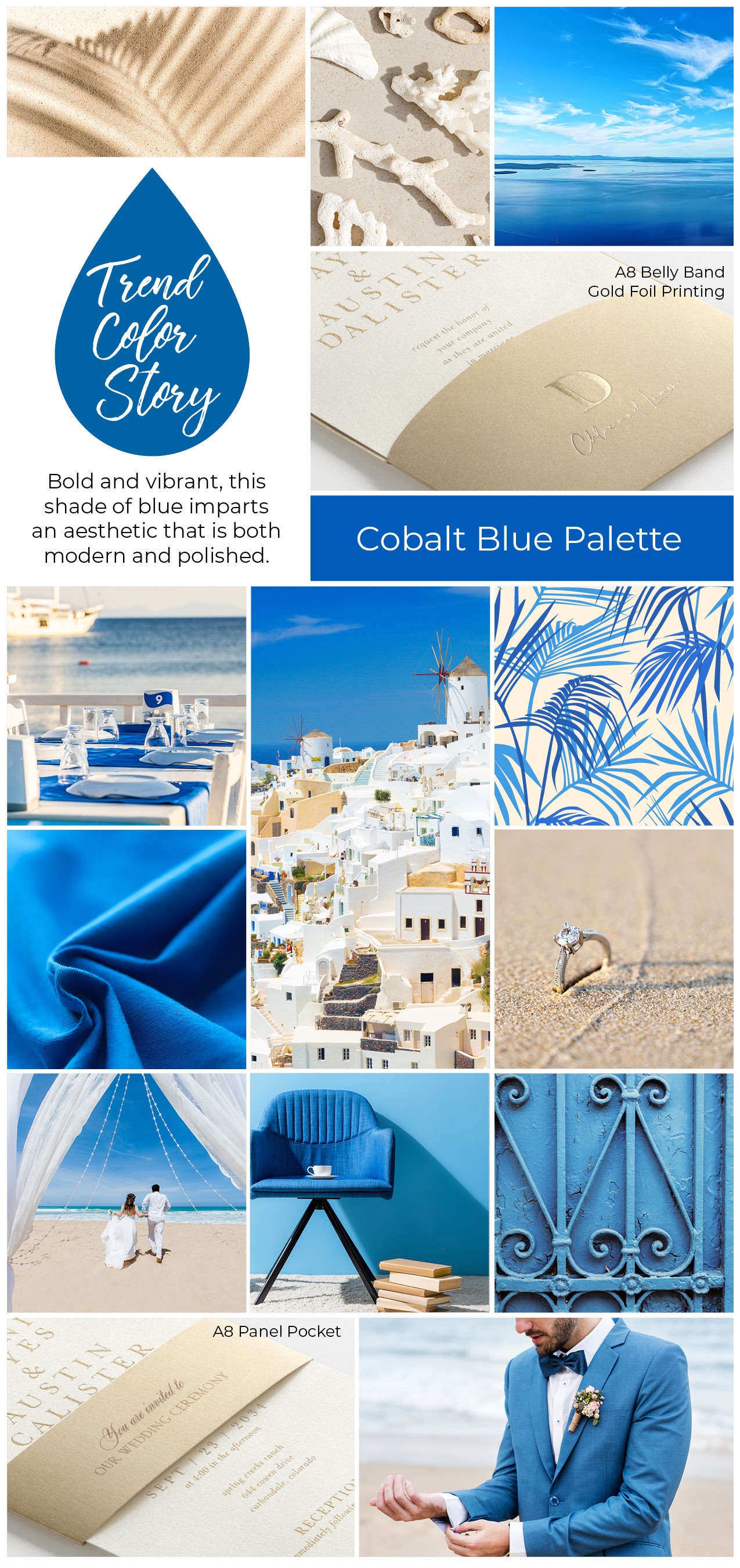 Cobalt Blue works especially well for events with a clean, modern aesthetic — think seaside weddings, rooftop soirées, or destination celebrations with a breezy, sophisticated feel. It pairs naturally with nautical elements, airy fabrics, organic textures, and architectural lines. Designers can lean into its vibrancy when creating invitations, menus, travel-themed stationery, signage, or modern event suites that demand visual impact.